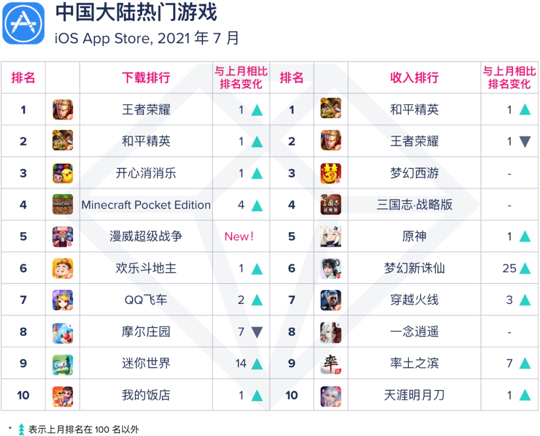 目光聚集回中国大陆,iOS 7 月抢手游戏中,由网易游戏和漫威协作推出的MOBA《漫威超级战役》正式上线,现在调查 7 月当月《王者荣耀》的 MAU 仍然稳健。作为网易抢占 MOBA 赛道的又一次测验,让咱们继续重视这款凭借漫威大 IP 的游戏是否能有继续的杰出体现。