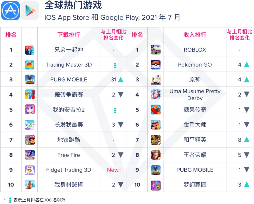 在 7 月全球抢手游戏下载榜单中,超休闲跑酷游戏《兄弟一同冲》继上月登顶冠军后继续连任;7 月榜单中呈现了两款体裁为模仿玩具买卖的超休闲游戏 – Trading Master 3D 和 Fidget Trading 3D,其间 Fidget Trading 3D 除了买卖场景外,也在关卡中添加了揉捏泡泡的 ASMR 解压环节,以添加改变和趣味性。